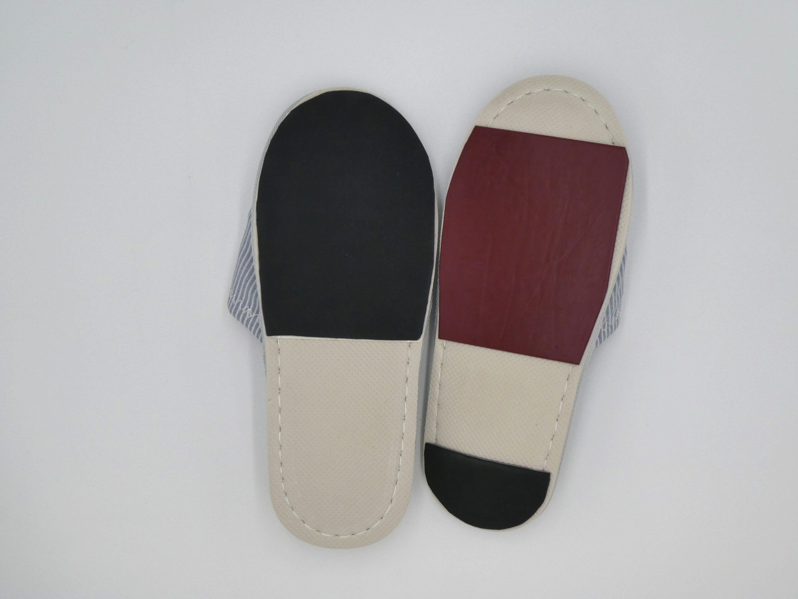 左足の甲を骨折して以来、足を引きずって歩いている祖母が家の中を歩きやすくなるようなスリッパを考えました。右足の裏には滑り止めのゴムシート、左足の裏には前半分に家具の移動を楽にする滑りのよいシートをはりました。このスリッパをはくと、右足に重心がかかった時に滑り止めで安定し、滑りやすくなった左足を軽い力で楽に前に運ぶことができます。左足のかかとには滑り止めを付けて安全性にも配慮しました。祖母は、左足の滑りがよくて歩きやすいと喜んでくれました。 |