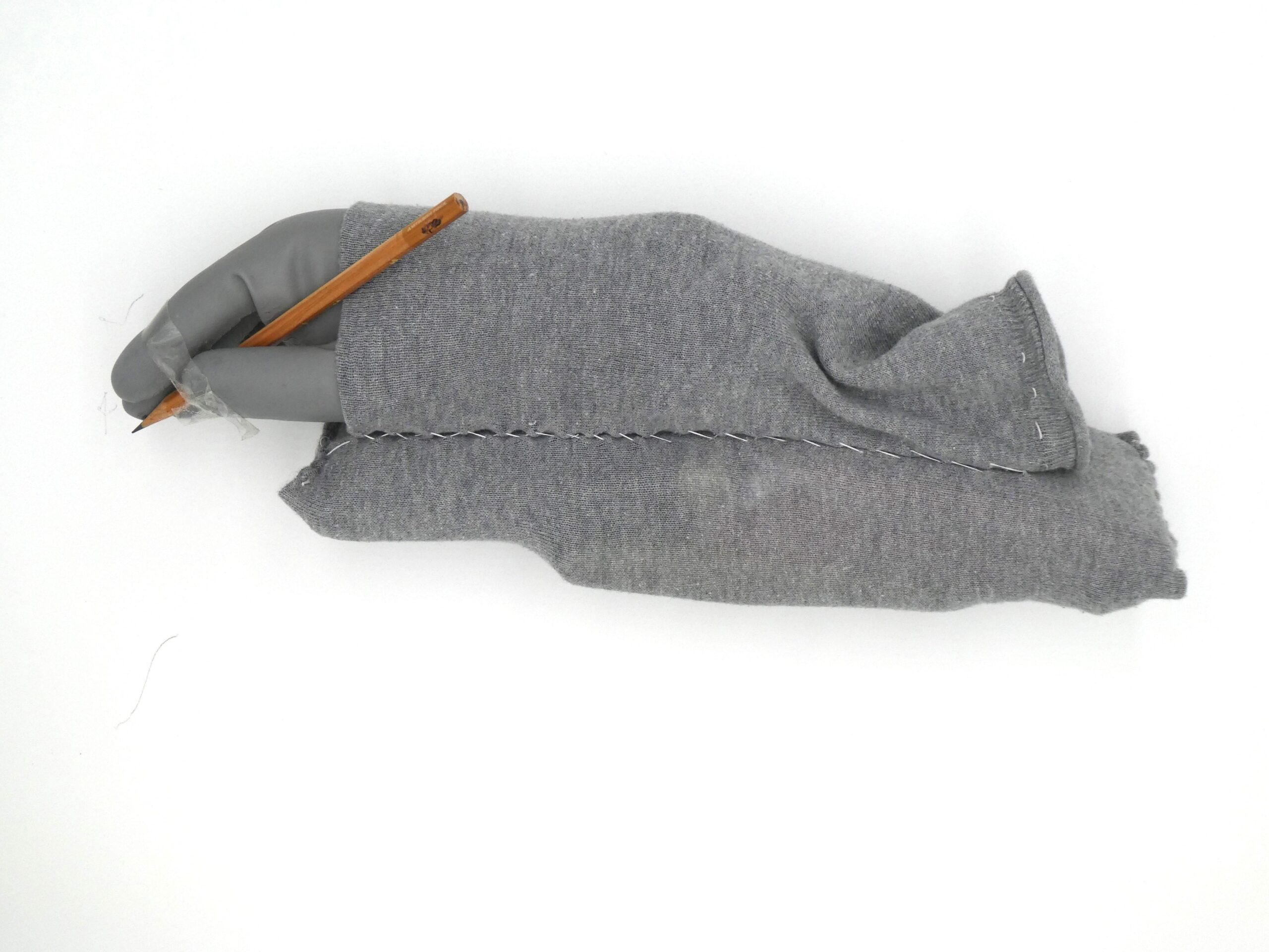 私の姉はしえん学校に通っています。しょう害があり思いどおりに体が動きません。学校で字を書く練習をしていると聞いたのですが、先生にたくさん介助されていることに気がつきました。姉1人で自由に字を書けるようになってほしいと思い作品を作ることを決めました。授業で使用してもらい姉からアドバイスをもらいました。それをもとに何度も作り直しました。よごれても良いように洗うことのできる設計にしました。アームカバーに右うでを通し、吸盤を右うでの右側にはりつけます。 |