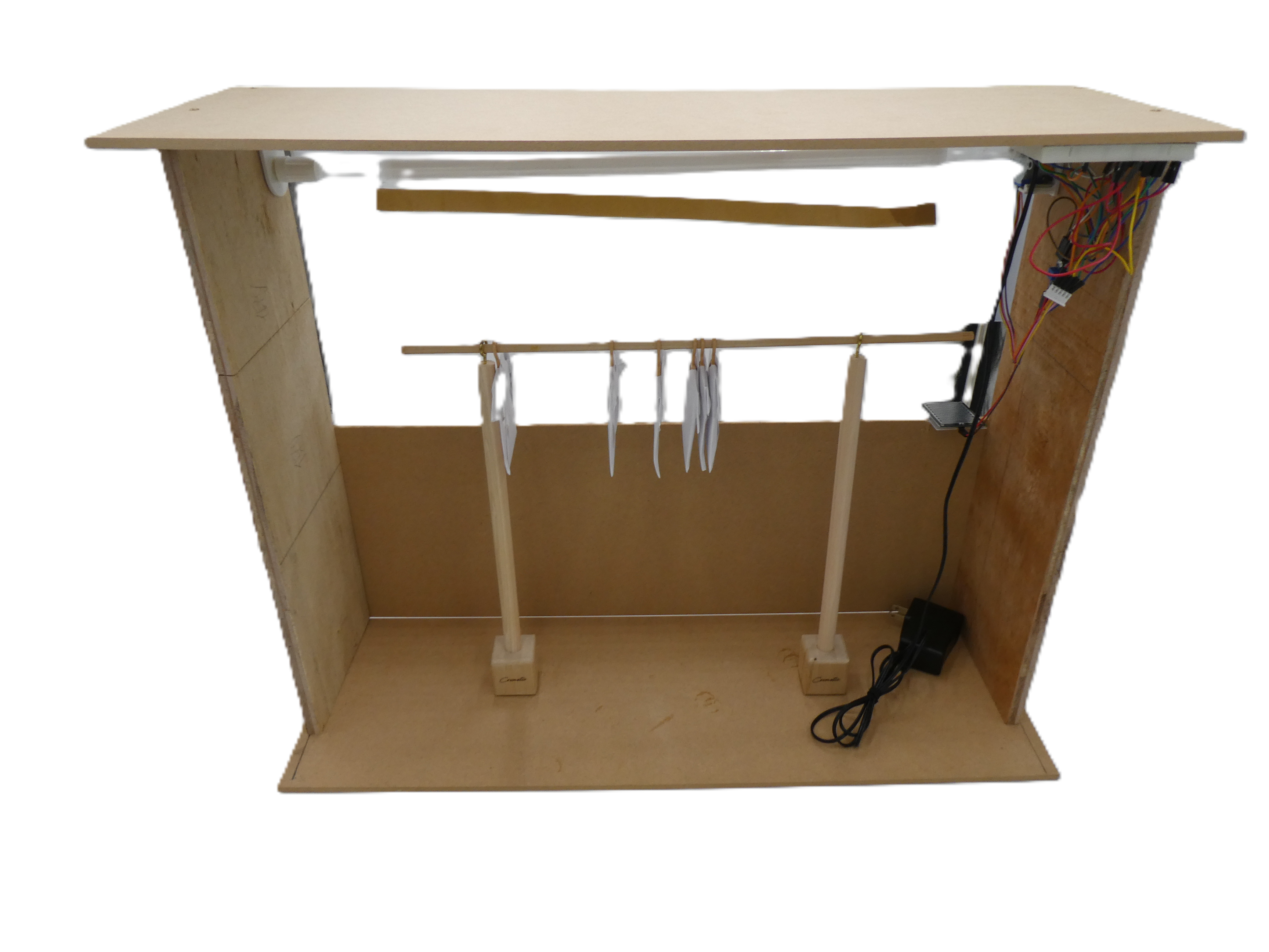 外壁に付けた雨滴センサーが雨を感知すると、自動で雨ガードシートがおりてきて、洗たく物が濡れるのを防ぎます。雨があがって雨滴センサーの雨粒が蒸発すると、雨ガードシートが自動で上がって、またお日様干しができます。この動きは、センサーとステッピングモーターをプログラミングで連動させていて、雨の感度は調整できます。本物のサイズでは作れないので、ミニチュアサイズで作りました。日本の気候が亜熱帯化してきて、突然の雨が増えたので、これがあると安心して出掛けることができます。
