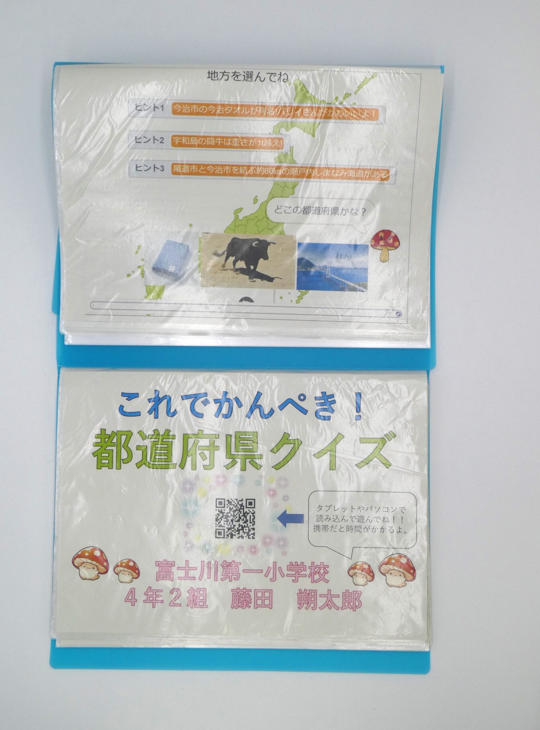 ぼくは、4年生になって社会科で都道府県を勉強したけど、なかなか覚えられなくて苦労しました。友だちも困っていたので、みんなで楽しく覚えられるゲームを作りました。このゲームでは、ヒントの写真を見て、県の特産品も一緒に覚えられます。クリア表もあるので、がんばり続けられて楽しく勉強できます。使い方は、QRコードを読み取ってクイズに答えるだけです。くわしくはP3.4.5を見てください。 |