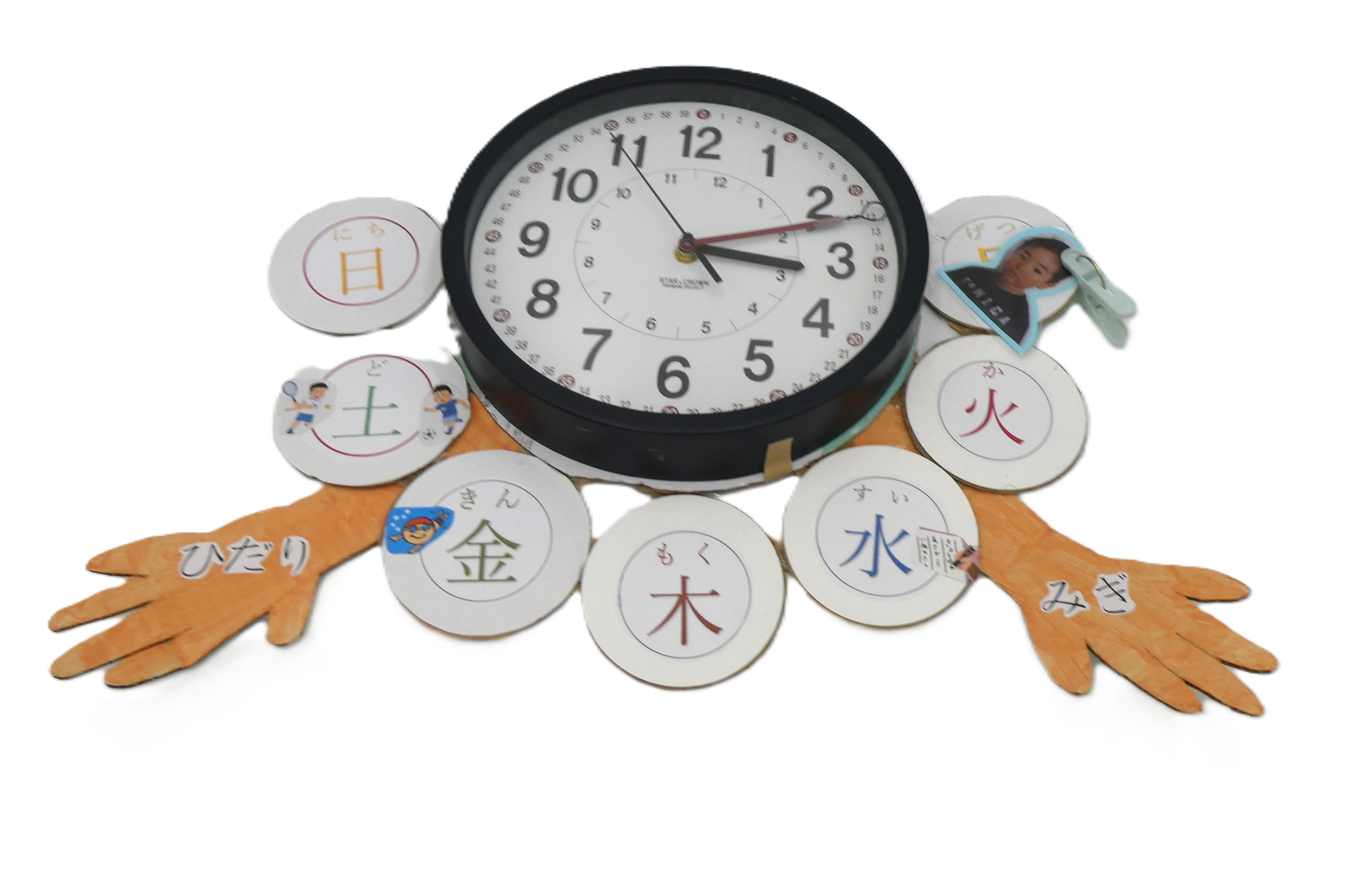 これ1つで時間、曜日、左右が分かり、保育園児がその勉強をするのに役立ちます。時間のはりの先にはり金で丸を作ったものをつけ、その丸の中に○分が入るようにしました。今○分かがすぐ分かります。また時計のまわりに習い事をはった曜日シートをつけたので、弟の写真を今日の曜日にせんたくバサミでつけることで曜日と予定を覚えることができます。そして時計に右手と左手をつけて、ぱっとみただけで左右がわかるようにしました。勉強用なので正面からみたときの右と左になっています。